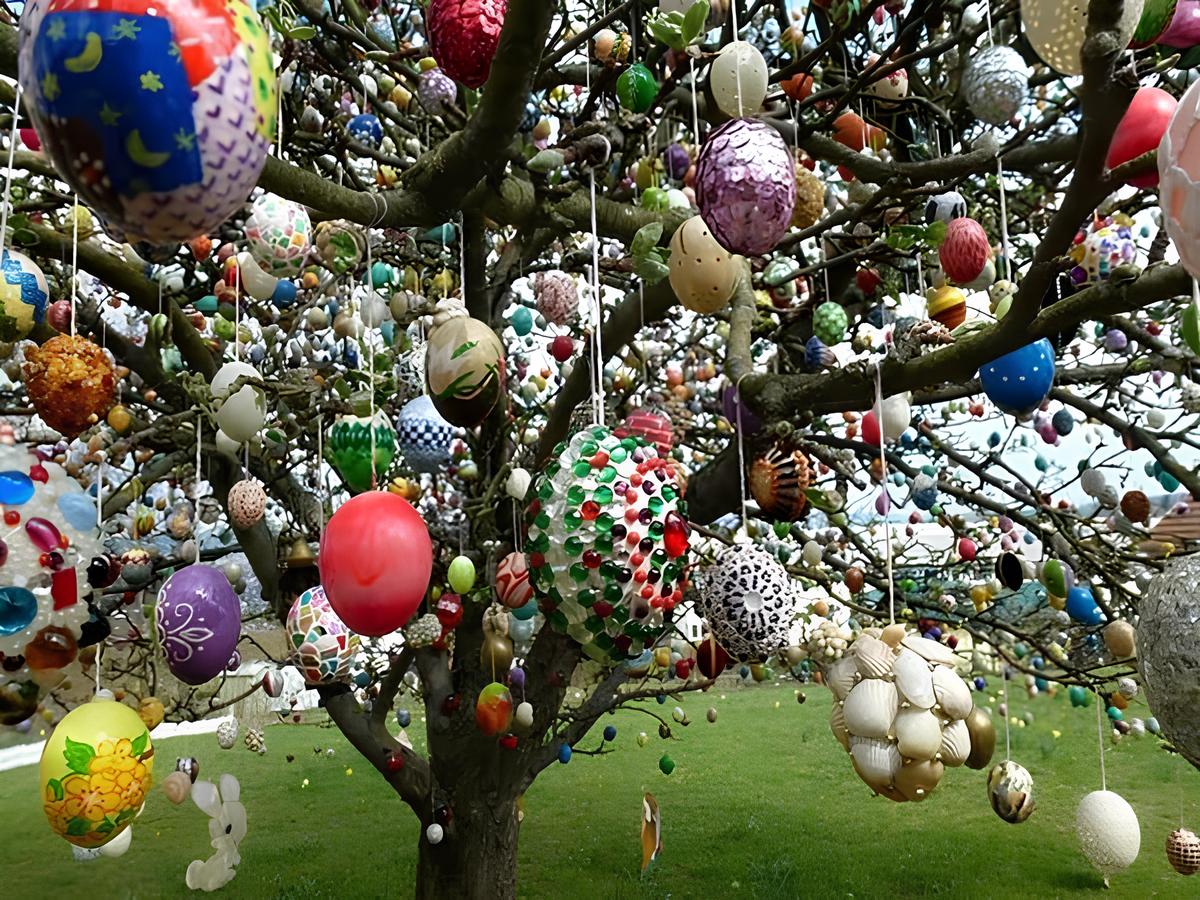 Посреди парка «выросло» пасхальное дерево! Почти на каждой его ветке висели разноцветные крашенки – традиционные яйцеобразные сувениры, сделанные из разных материалов. Они были украшены аппликационными орнаментами, а также силуэтами цветов из бусинок и ткани. Каждая такая поделка – маленький пестрый шедевр, сделанный ребенком.